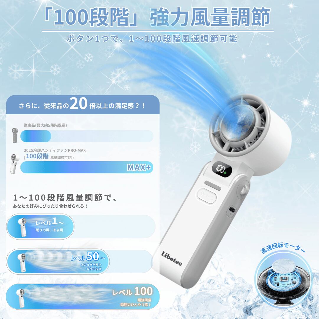 このハンディファンは、ターボファンと大容量バッテリー(3,600mAh)を搭載したポータブルファンです。100段階風量調整に対応し、モードにより最長約12時間の連続使用が可能。冷却プレート内蔵で送風+冷却効果を実現。Type-C充電対応、滑り止め加工付きで屋内外問わず快適に使用できます。