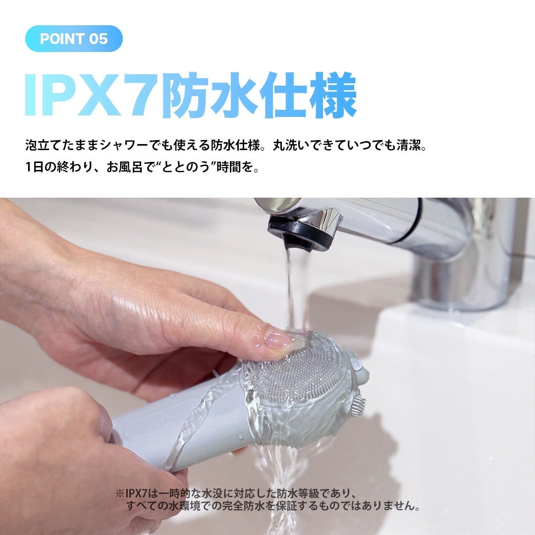 低刺激シリコンブラシが敏感肌にもやさしく、6段階の振動レベルで肌状態に合わせたケアが可能。